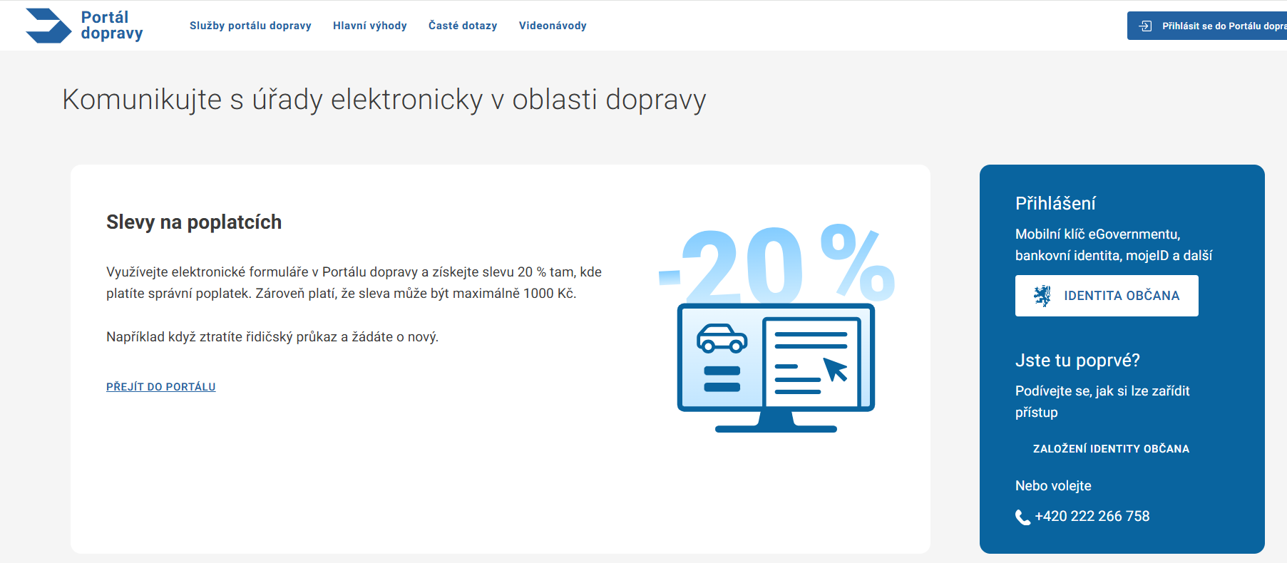 Portál dopravy je státní internetový portál Ministerstva dopravy České republiky, prostřednictvím kterého lze řešit dopravní záležitosti přes internet. Nejde o mobilní aplikaci, ale o webovou stránku, do které se uživatel přihlašuje například pomocí bankovní identity. Díky tomu už v mnoha případech nebude nutné osobně navštěvovat úřady.