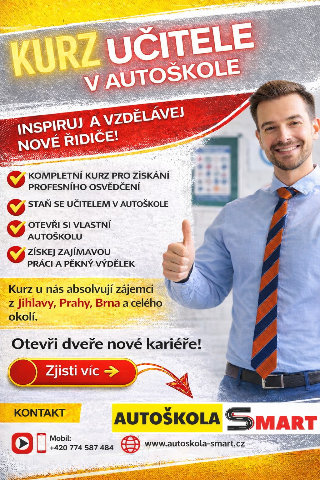 U nás je možné absolvovat kurz učitele autoškoly, který je určen všem, kteří chtějí tuto odbornou činnost vykonávat profesionálně a zodpovědně. Kurz vychází z platných požadavků na přípravu učitelů autoškol a je veden s důrazem na praxi, bezpečnost a kvalitní přenos znalostí.